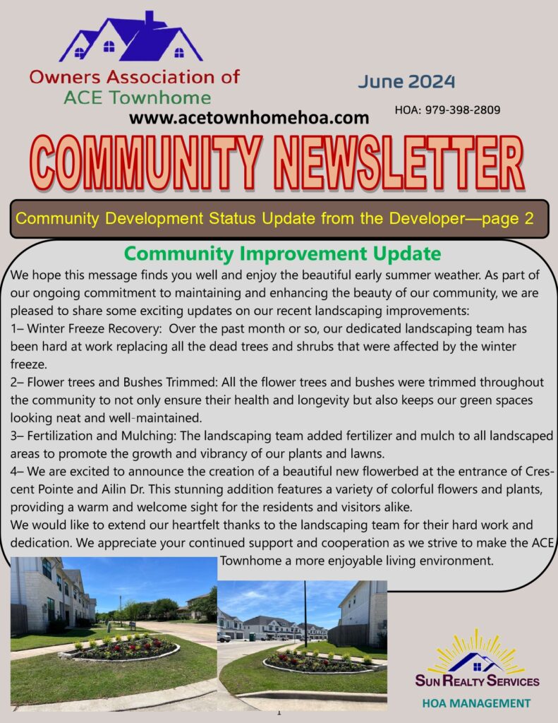 ACE HOA Townhome June Newsletter August 20, 2024August 20, 2024 adminACE HOA Townhome June Newsletter 0 Comment Post navigation Previous page Previous post: ACE Townhome September NewsletterNext page Next post: ACE Townhome March 2024 Newsletter