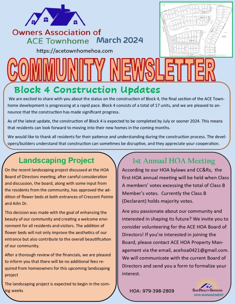 ACE Townhome March 2024 Newsletter August 20, 2024August 20, 2024 adminACE Townhome March 2024 Newsletter 0 Comment Post navigation Previous page Previous post: ACE HOA Townhome June NewsletterNext page Next post: When Should Your HOA’s Assessments Be Due?