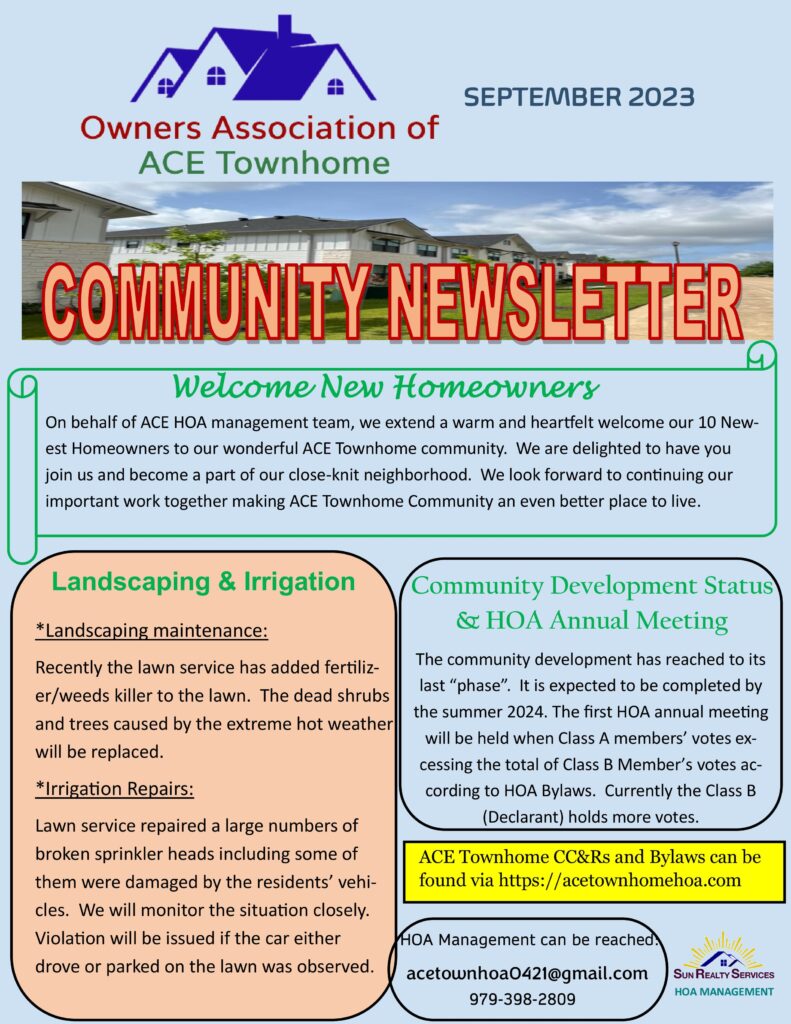 ACE Townhome September Newsletter August 19, 2024August 19, 2024 adminACE Townhome September Newsletter 0 Comment Post navigation Previous page Previous post: Warm Welcome!Next page Next post: ACE HOA Townhome June Newsletter